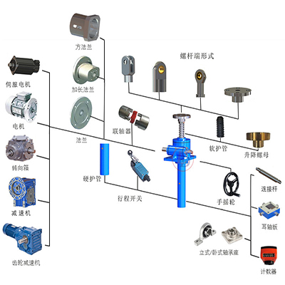 1、 JWM型(梯形絲桿型)適用于低速、低頻率的場合, 主要構成部件為:精密梯形絲桿副與高精度蝸輪蝸桿副。