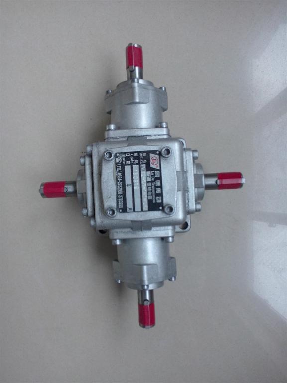 ,雙輸入軸,雙輸出軸,內部有兩對傘齒輪,雙脖子的輸入方向相反,中間通軸的輸出方向相同。