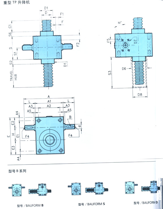 TP系列升降機,TP升降機:TP機械絲杠升降機操作簡單,可靠性強,低維修率等優點, 使螺旋千斤頂有著廣闊的應用范圍.TP機械千斤頂配有自 動連鎖機構,即他們能支撐自身重量而不必采用閘或其它 鎖定系統.千斤頂可單獨使用也可與軸、聯軸節,傘齒輪傳動器結合共同使用。他們可由交流或直流電機驅動,也可由液壓或氣壓電機驅動,他們可手動驅動也可用其它傳動形式;