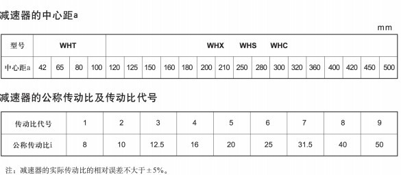 ,有多種中心距和速比可選。中心距用實際數字標示,單位為厘米;傳動比用工程傳動比表示;裝配型式用羅馬數字Ⅰ、Ⅱ、Ⅲ、.....表示,帶風扇的在其后加"F"字面表示。